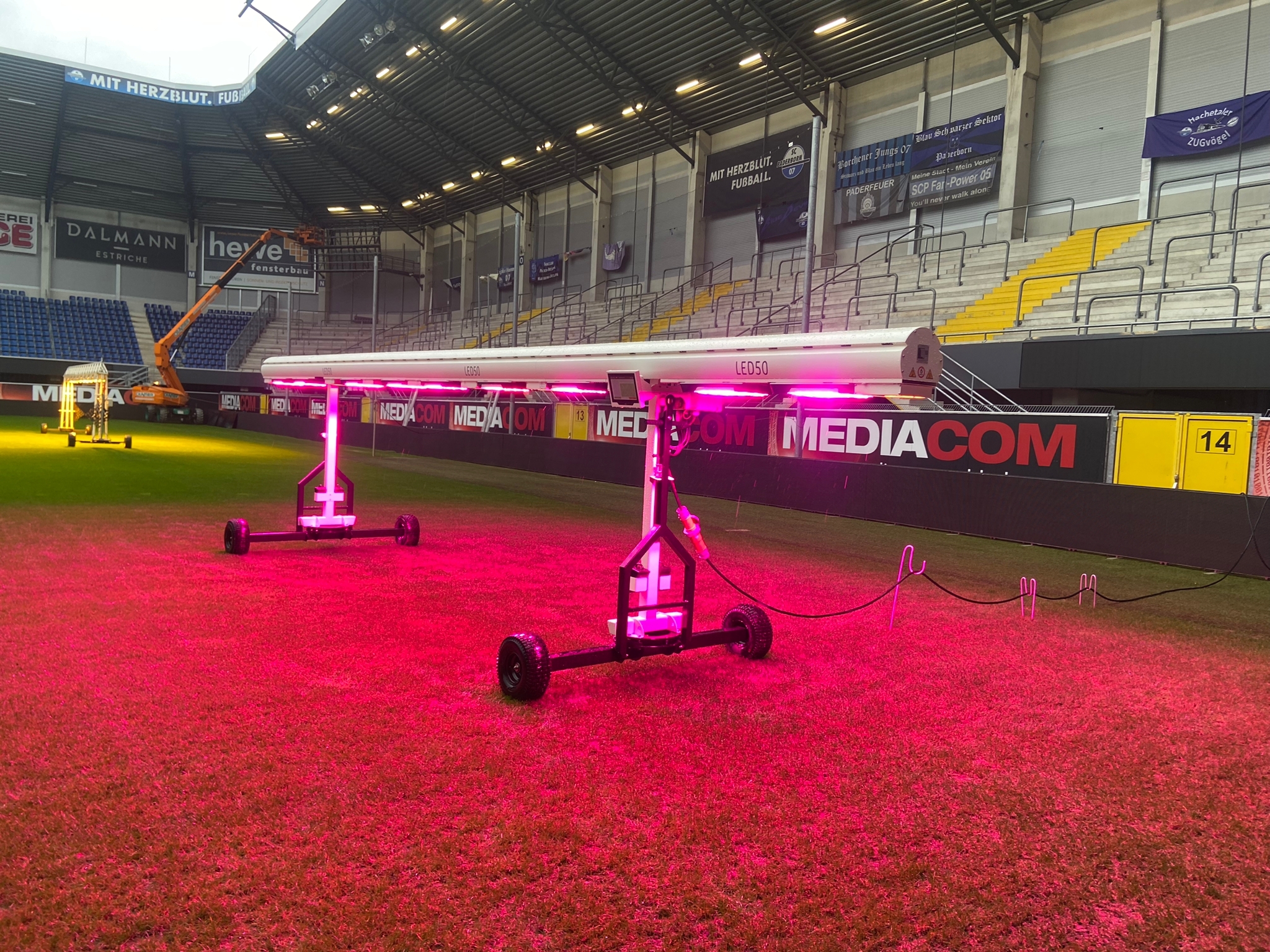 Paderborn wants to make an active contribution to protecting the environment and confirm its status as a (local) pioneer in the field of sustainability. The club therefore decided to invest in an efficient LED pitch lighting system. In order to confirm its status in German professional football, the club also wants to further professionalise the maintenance of its pitch. A major challenge is that the field is used for frequent play, which leads to more actual damage than on a hybrid pitch. The club’s management therefore decided to invest in three LED50 lighting units for optimised pitch maintenance of its pitch and management in order to improve the quality of the pitch and treat the high-traffic areas effectively.